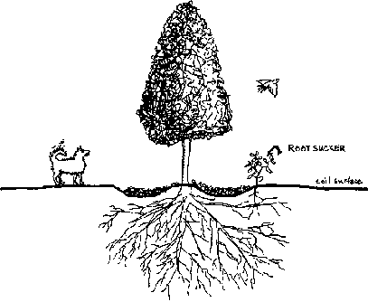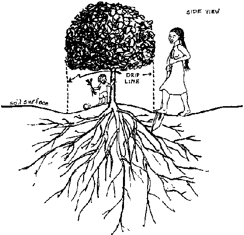 There are two easy-to-identify patterns of root growth: fibrous and tap roots (Figure 5.4). Fibrous roots spread out and downward in a mass of fine roots, none of which dominate. Fibrous root systems include many secondary and tertiary roots, or lateral roots, those that grow out of an older root and therefore do not tend to grow straight down (refer to Figure 5.1 in section 5.1). Monocots like maize and sorghum commonly have fibrous root systems. Garden crops that are dicots, for example, carrots, okra, chilis, sweet peppers, and amaranth, have a tap root, a dominant vertical root with other smaller roots growing out from it. These tap roots can make use of water deep below the soil surface. Many dryland fruit trees such as carob and olive also have a tap root. When the tap roots of mature plants are cut off, for example, in transplanting, the plants may die. Some of these plants can recover by developing alternative roots in a pattern similar to a fibrous root system. However, this will only occur if the plant is young, vigorous and its shoot system is relatively small.