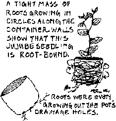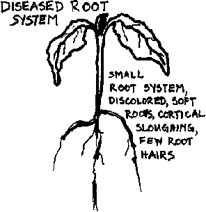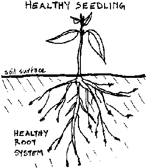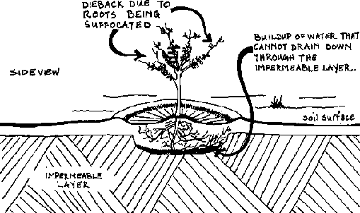 Poor drainage and overwatering also cause shallow rootedness as the roots avoid waterlogged soil. Watering patterns that encourage shallow rootedness can lead to other problems such as salinity (section 12.6.2) or roots growing primarily in upper soil layers where temperatures are high, both of which can inhibit growth and kill the plant in severe cases. For these reasons, when watering established seedlings and older plants it is important to wet the soil down to at least 15-40 cm (6-16 in), and below this for trees, in order to encourage deep root growth. However, because compensatory growth is a gradual process, one should not switch abruptly from frequent shallow irrigations to less frequent deep irrigations without a transition phase of deep but less and less frequent waterings.