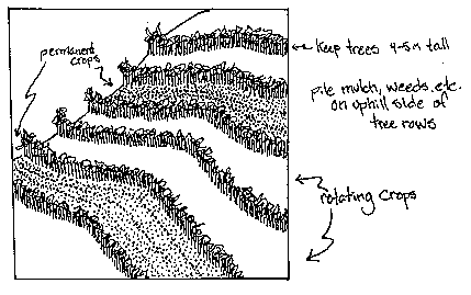 Every third strip is planted to a permanent crop such as fruit trees. The two intervening strips are planted to field crops like corn or cassava. The field crops should be rotated. For example, pineapple might be planted after beans have been harvested. If you want more information on this technique, contact ECHO for the 10-page illustrated Technical Note. The Center has many other demonstrations which integrate forestry, forages, animals, and home gardening techniques. They also sell seed of several species. Contact Mindanao Baptist Rural Life Center, P.O. Box 94, Davao City 8000, PHILIPPINES. [The fertilizer and mulch benefits of SALT are so great that a similar system is used even on flat land where erosion is not a problem. There it is called alley cropping.]