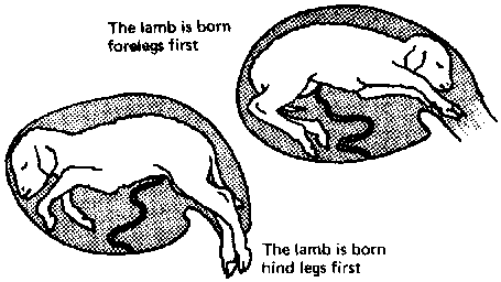 Next you see the legs of the young animal coming out, either the two forelegs or the two hind legs.