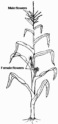 When the female flowers of one maize variety are fertilized by pollen from the male flowers of another maize variety, this is called crossing. The flowers fertilized in this way produce a new variety of maize called a hybrid, which is better than the two original varieties. But after several years of growing maize from the previous crop's seeds, this new variety loses its good qualities. So new seeds have to be bought.