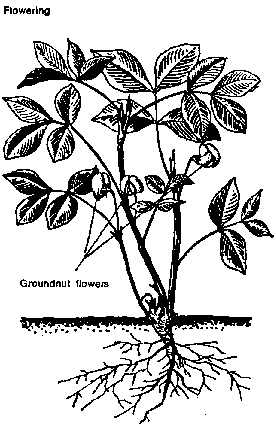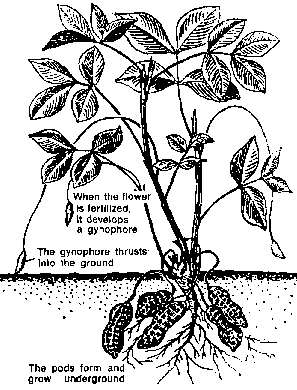 The flowers when fertilized develop gynophores. The gynophores penetrate the ground and the pods and nuts develop from them.