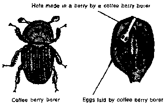 These insects lay their eggs in the coffee beans. The berries turn black. Remove the black berries and burn them. Pick up all the berries that have dropped to the ground and burn them.