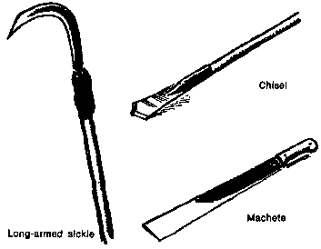 For oil palms 4 to 7 years old Cut the clusters with a chisel. Slip the chisel between the stem and the leaf; in this way you can cut off the cluster without cutting the leaf below it.