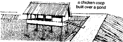 124. You can raise chickens or pigs near your ponds. If you build chicken coops or pig pens on the banks or over the ponds, you can sweep the manure into the ponds. Your ponds will supply water for the animals and the animals will supply fertilizer to help keep the water in your ponds rich.