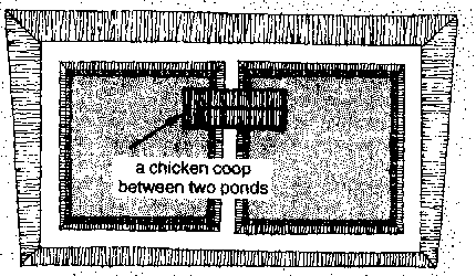 a chicken coop or a pig pen on top of the bank between two ponds and sweep the