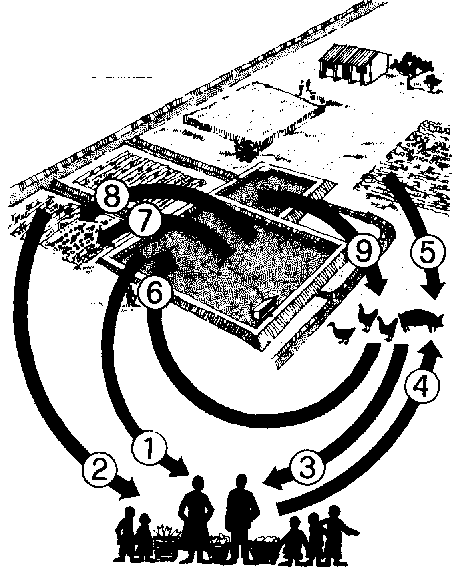 121. You have already learned how to put animal manure into your ponds so that the water will be rich in the natural foods that your fish need to eat. In this way, the animals help the fish to live and grow better.