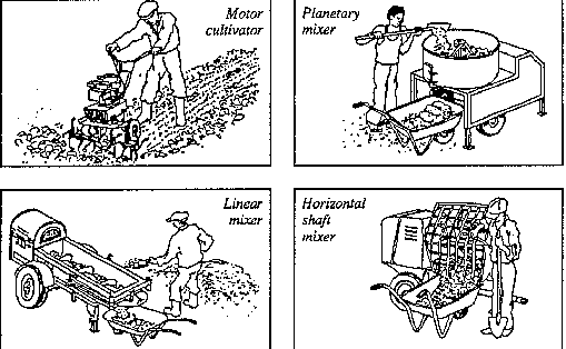 Not so much equipment has been designed especially for earth construction. Some of the existing equipment is part of an integrated production line and is difficult to purchase' separately. However, equipment used in agriculture and the ceramic industry can also besuitable for earth construction. Conventional rotary or tilting concrete mixers are not recommended, because of the formation o lumps. There are four principal types of mixers