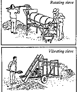 These are motorized and have one or more vibrating screens placed one above the other They permit successive sifting and the division of earth into several portions, which again al lows for the reconstituting of the earth texture with selected portions. Vibrating sieves for large outputs are often complex, heavy and consume a lot of energy, while those for small scale use are simple and easy to manufacture