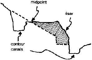 3. Bench terrace. Bench terraces can be dug at the hillside. The steeper the hillside' the smaller the terraces. It is recommended that the topsoil be removed first, the terraces constructed and then the topsoil placed evenly on the terrace. The riser should slope gently to reduce erosion. A contour canal is dug at the base of the riser and a small mound of soil is constructed at the edge of the terrace to prevent soil loss.