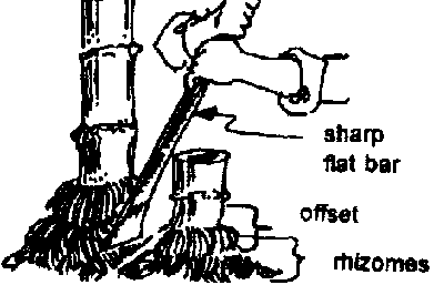 The offset method can be applied to bamboos such as anos and buho which have loose clumps that are not producing prominent branches with well-developed basal parts. These bamboos are difficult to propagate either by culm or branch cuttings.
