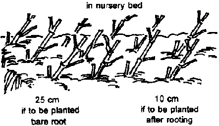 These one-node culm cuttings can be raised in containers or in nursery beds. Plant the cuttings in a slanting position with the branch stub at the upper side of the node. Plant the cuttings with a portion of the culm internode the branch node exposed. Ordinary garden soil or sandy loam soil is the preferred growing medium.