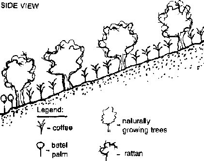 3. Outplanting coffee saplings. Dig 30-cm holes at 2-3 m intervals under the forest canopy. Two coffee saplings are usually planted in each hole. Rattan and betel wildlings about 30 centimeters tall are collected from mother plants. (See Growing Rattan, pages 48-55 in Trees and their Management). Three to five rattan seedlings are planted beside each naturally growing tree. Betel seedlings are planted along the transition between the forest and the annual cropping area or rice paddies 4-5 meters apart.