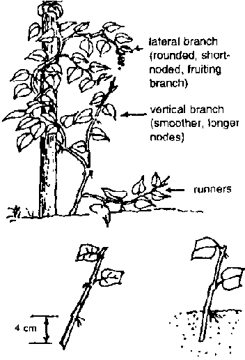 Blackpepper. Choose the runners or the vertical, climbing branches for propagation. Lateral branches do not climb. Cut four to six cm from the node, leave two to three nodes for every cutting. Rooting hormone is not needed. Plant into chamber.