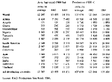 Production - world output increased on average 2 per cent/a for the period 1974-84, reaching nearly 129 million tonnes of roots (corresponding to about 46 million tonnes of grain equivalent). The largest increases were in Laos, Thailand, the Philippines and Vietnam, but Brazil showed a decline. A slight fall in 1982 was mainly the result of lower production from Thailand. In Africa, supplies still fell short of the food requirements of the population. In the Far East consumption increased in China, Indonesia and the Philippines. World wide, about 65 per cent of the production is consumed direct as human food and about 30 per cent is consumed or processed as animal feed, of which about half is exported (see next section). About 4 per cent is converted into starch and other industrial products and rather less than I per cent into ethanol, mostly in Brazil.