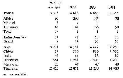 Trade - because fresh cassava deteriorates rapidly only a very small quantity of fresh roots is traded internationally, mainly to immigrant populations. However, substantial quantities of processed roots (chips and pellets) and cassava starch are traded; world trade in 1981 is estimated to have exceeded 17 million tonnes in root equivalent, compared with 14.7 million tonnes in 1980. Tables 2 and 3 show gross imports and exports for the major cassava trading countries. Exports from China, Indonesia and Thailand rose substantially, with Thailand providing nearly all the 5.5 million tonnes to the EC permitted by a 'voluntary' agreement which reduces this quota to 5 million tonnes for 1983 and 1984, and 4.5 million tonnes for 1985 and 1986. With present EC policies, the market for cassava as animal feed seems unlikely to develop further, nor does there appear to be much likelihood of increased demand elsewhere: 1981 may represent a peak year for trade in this commodity, with relative stability or a slight decline in the forseeable future.