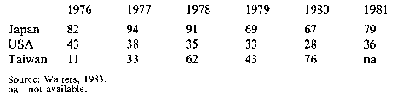 Only about 4 per cent of world starch production moves in trade and most of this is cassava starch: the major importers are Japan, the USA and Taiwan. However, in the USA home-produced maize starch is taking the place of cassava starch and in Japan the domestic starch industry is highly protected by quotas and tariffs, with the result that there has been a decline in imports of cassava starch in these countries. Only in Taiwan has there been an increase. Table 4 shows production of cassava starch and