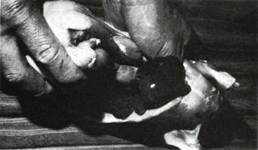 Hotels, restaurants, hospitals, clubs, and other establishments usually purchase the whole carcass with the liver intact. Their chefs prefer to cut them to meet their own requirements. Housewives usually prefer the cut-up packaged product. Cut up the fryer rabbit with a knife; using a cleaver may splinter the bones. Common cuts from fryer carcasses are illustrated in figure 30; in large commercial processing plants, a bandsaw is used. For sale in supermarkets, a paraffined box with a cellophane window makes a neat, sanitary package for the chilled rabbit carcass. If the package is to be handled considerably or the meat is to be frozen, use a box without the cellophane window, but wrap the meat or the box in a special wrapping to prevent freezer burns and loss in palatability.