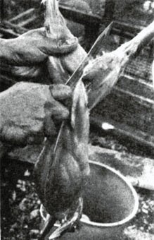 Do not feed the rabbits the day before butchering them, because much of the skins are either wasted or saved during the cutting process. The butcher should know how to butcher the rabbits. In order to skin a rabbit properly one should first suspend the rabbits by its hind legs securely facing the butcher. With his left hand the butcher holds the head firmly and in his right hand, he holds a sharp knife. His left hand then pulls down the rabbit with a jerk to break its neck and then his right hand cuts with the knife just behind the head to drain the blood. When the blood is drained, continue the cutting across the back of the head clown to the tip of the jaw including all of the thick fur covering the neck and jaw (Fig 32).