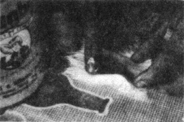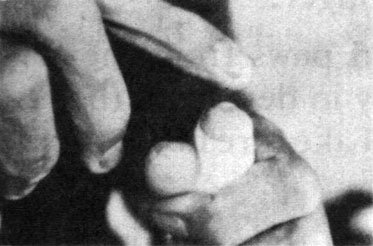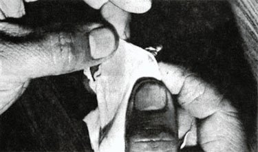 18. Then wet your finger and smooth all rough spots on this mound of thick glue. The reason is, this glue dries very hard and any jagged edges will cut you easily (Fig. 63).