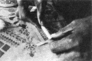 When these solutions are dissolved, slowly pour the salt-soda solution into the alum solution at the same time stirring with a wooden spoon or paddle. While waiting for the mixed solution to cool off, deflesh your skins to be tanned. Defleshing is one of the hardest parts of tanning. It is done by starting from the back portion of the skin and slowly working the flesh off in a circular pattern (Fig. 38). When all the skins are defleshed, immerse them into the tanning solution for three to thirty days. Stir the skins three times a day since the chemicals separate and settle to the bottom of the pail.