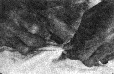 When the skins are about 95 per cent dried, start working or kneading them. Stretching or buffing the skins until they are as soft as linen handkerchiefs may take hours (Fig. 41). This is also one of the most critical parts of the tanning process. Negligence can never be repaired. the more you buff the skins the better. When the skins are well dried and soft and are ready for use, powder them with talcum.