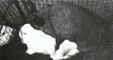NATURAL MATING is the best method. When ready for breeding, females will show reddening of the vulva. Deep reel coloration indicates the female will usually accept the male and conception should occur about 75 per cent of the time. Females may be rebred after their litter is 45 days old allowing a short rest period after weaning. Females in season should be introduced to the males cage. (Fig. 2) If acceptance does not occur within a few minutes, remove the doe and attempt to breed again in the late afternoon or the following morning. This timing method gives the highest conception rate- up to 90 per cent or more.