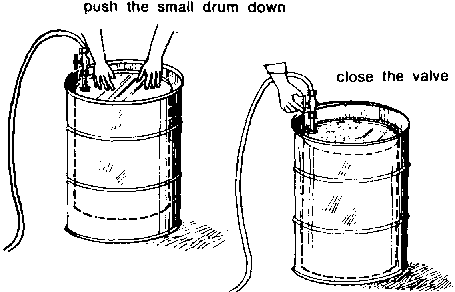 101. To let the gas out, push the small drum back down into the waste mixture in the large drum. This will force all gas and air out of your biogas unit. Then, close the valve or clamp or tie the gas line and your biogas unit will begin to collect gas again.