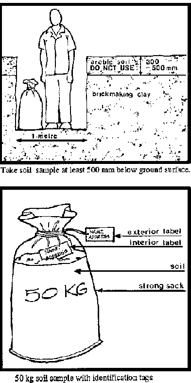 If the soil is to be analyzed in a soil laboratory or if it is to be transported to another village for an experienced brick maker to test, you will need to provide them with at least 50 kg of each soil sample. Put each soil sample into a separate strong sack. Do not mix them together. Each sack should be identified with a tag with the following information: