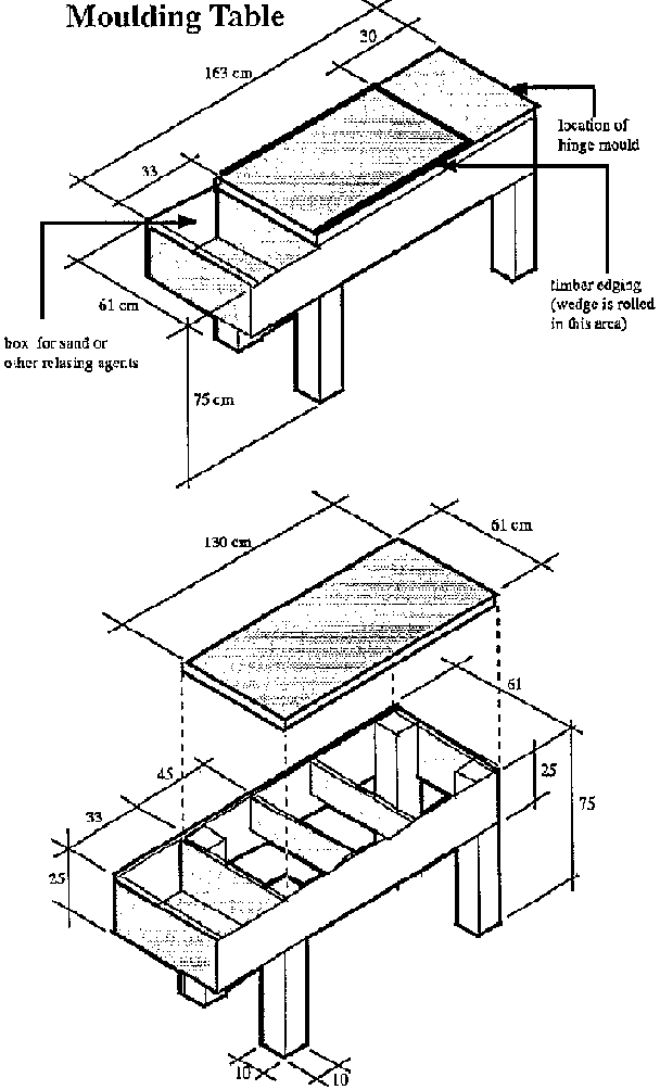 Before beginning to make the hinge mould you must determine two things. First, what will be the final fired brick size and second, how much does the soil shrink from its moulded to its fired brick state.