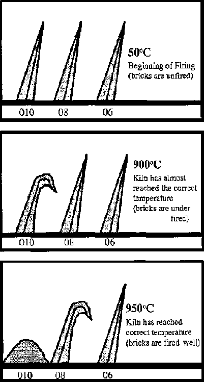 The cones are set at a slight angle in a special clay base. When the temperature of the kiln in the area of this set of cones reaches approximately 900°C, the first cone (no. 010) will begin to deform. When the second cone (no. 08) begins to deform, the kiln in that area has reached the correct temperature for firing bricks and this temperature should then be maintained for 12 to 24 hours. If the third cone (no. 06) begins to deform, the kiln has passed the desired temperature and there is a risk of overfiring the bricks.