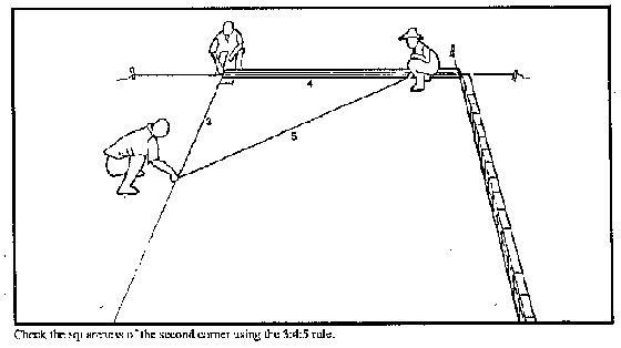 Step 3: With another cord, lay out the second side of the field kiln. The cord is stretched perpendicular to the first cord and should just touch the end of the last brick. Make sure the corner is a right angle (90°) by either using a large builder's square or using the 3:4:5 method. (See Appendix 3 for more detailed information on the 3:4:5 rule.)