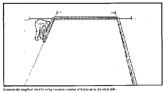 Starting at the point where the strings cross, lay the correct number of bricks end to end along the outside of the string. For example, a 22,000 brick kiln with 6 tunnels has a width of 14 bricks.