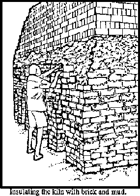 After finishing the construction of the field kiln, and before beginning to fire it, the exterior of the kiln must be insulated with mud and broken bricks.