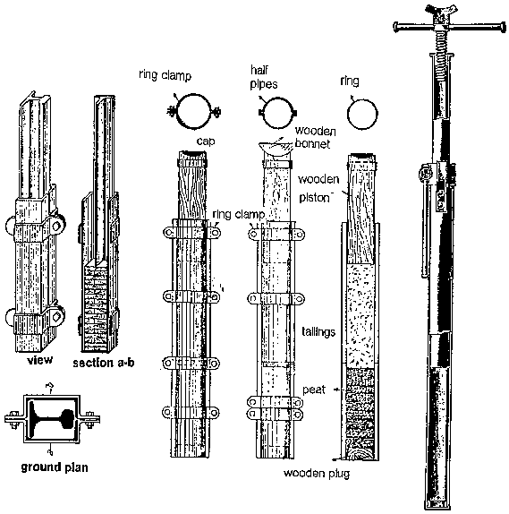 Timber employed in moist or wet mines, especially for shaft construction in exhaust ventilation shafts or drifts in water-bearing strata, should be previously treated by a preservative. Timbers are impregnated by dipping them into special solutions, such as Roman-salt, copper sulphate, etc., either with or without pressure.