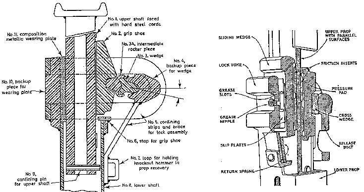 Timber support normally is not reuseable. The only exception is simple prop timbering for stoping which is sometimes recovered and the wood then reused for shorter props, head boards, breast timbers or wooden cribbing. In situations requiring excessive support, such as mining in incompetent rock, the cost off timbering becomes a significant factor in the economic analysis of the operation. Here the higher investment costs for friction prop support can result in a substantial savings In operation costs, since these support elements can be reused.