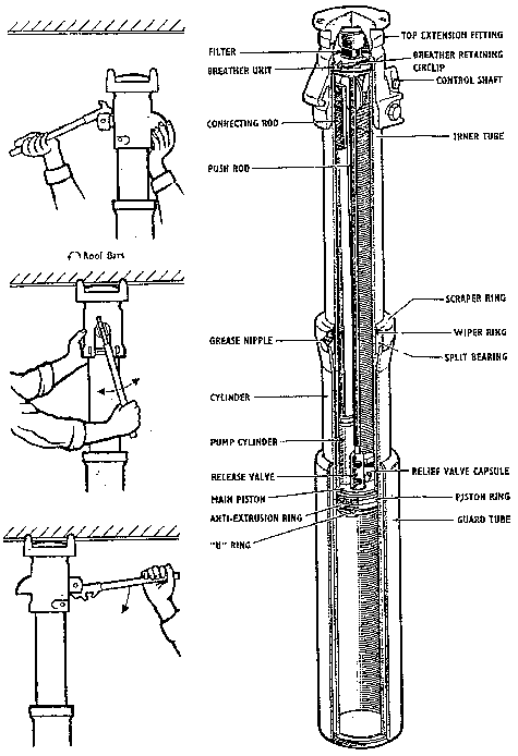 drawing (recovery) of hydraulic individual props with manual pump (left, from