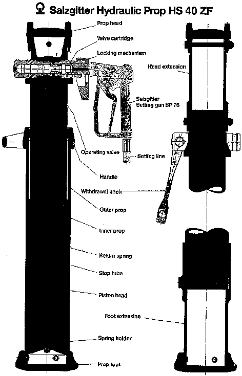 Use of hydraulic single prop supports is only practical and economic where incompetent roof or hanging wall require a support method which can be adjusted to meet rapidly changing conditions. Hydraulic prop supports are appropriate for short-term installations involving frequent changes of location due to rapid face advance, or where high prop-setting loads are desireable. Such conditions arise in coal mining with roof caving or backfilling, in longwall mining, in room and pillar mining, as well as in ore mining by overhand stoping. In addition, single hydraulic props are suitable for support of all special mining activites such as support of fault-zones or roof-fall areas, machine rooms, and face-roadway intersections.