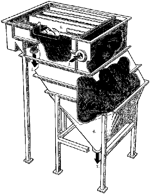 5. overflow outlet, 6. sludge collecting tank, 7. underflow outlet. Source: Sala