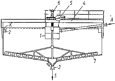 rabble arms with scrapers, A slurry feed, K clarified fluid, S thinckened