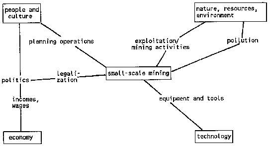 Small-scale mining activities and mine workers have an integral interrelationship with their surroundings -nature, culture and people, technology and economy: mining disturbs nature through the depletion of its natural resources and its deleterious impact on the environment, which it is dependent upon for its energy and raw materials. Mining on the one hand, and culture and people on the other, have greatly influenced each other since prehistoric times: mining activities provided culturally significant metals and precious stones; mining has always, still to this day, led the way for rural and technological development. Mining, with its tools and equipment, utilizes this technology to generate income through the materials it produces. This interrelationship can be depicted as follows: