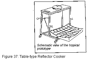 In addition to the solar cooker described here, ATRC also has do-it-yourself instructions for building a cheap, stationary solar cooker. Anchored firmly in the ground, it consists mainly of a double-pane glass cover on a black aluminum receiver surrounded by natural insulating materials (straw or the like and embedded in the ground. However, the type in question has made no appreciable progress toward dissemination.