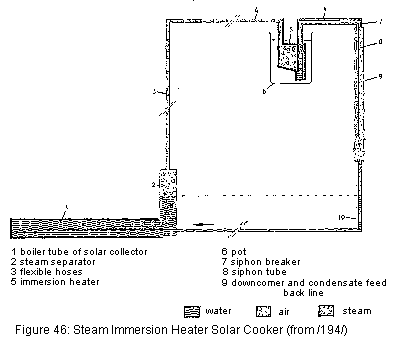 Solar collector tube, steam separator, riser and downcomer tubes, air well, siphon tubes, and immersion heater together make up a closed circuit, partly filled with water. Solar radiation striking the collector tubes generates steam which rises up to the immersion heater inside a cooking pot. Heat passes from the steam to the food, thus condensing the steam to water. A siphon tube evacuates the condensate via the downcomer back to the collector tube. An additional siphon breaker tube is installed to avoid water-air pulsations in the system.