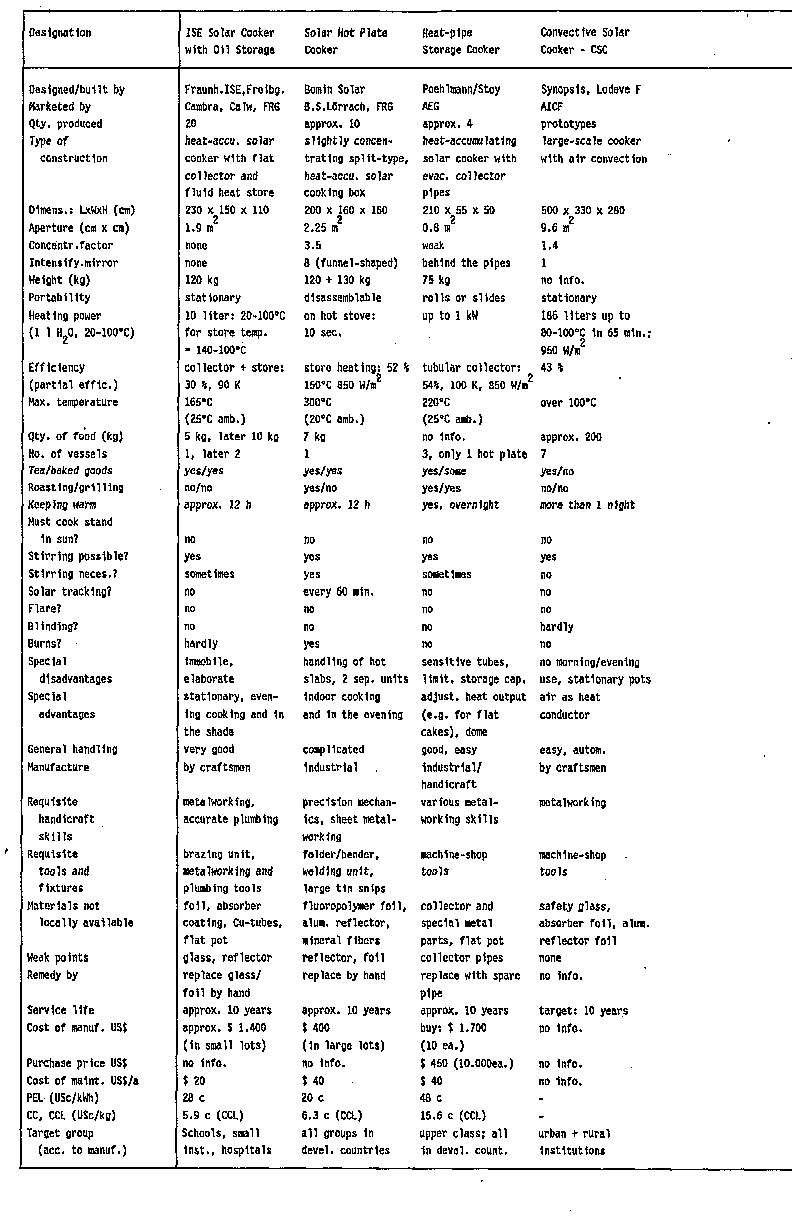 Various solar cookers that were devised in developing and industrialized countries for use in developing countries are described below. The individual illustrated descriptions precede a tabular summary comparison.