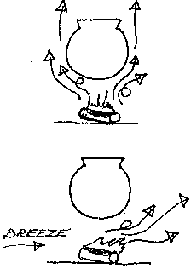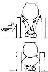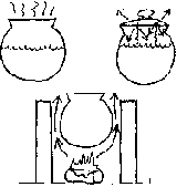 Heat is also lost from the cookpot (Fig. 5-14). For heating efficiency, the best cookpot would have a large surface area exposed to the fire, and a small area exposed to the air: Both convective and radiant heat loss from the exposed surface of the pot can be lessened by sinking the pot into the stove. The pot will also gain conducted heat from the hot stove walls. Covering the cookpot (Fig. 5-15) prevents convective and evaporative heat losses from the contents inside. This may reduce total heat loss by up to one half.