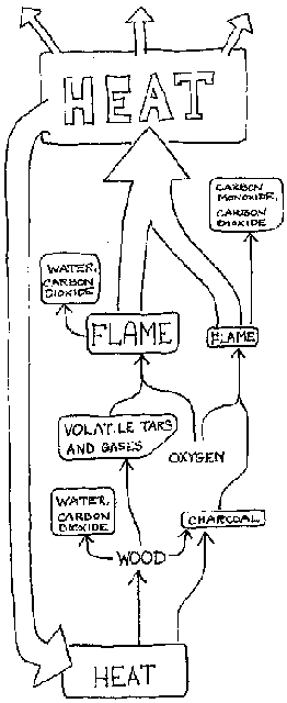When a piece of wood is added to a fire, chemical changes occur in the presence of heat. At first, non-flammable carbon dioxide and water are given off. As the temperature increases, combustible gases and tars are also evolved. This process of chemical degradation in wood is called pyrolysis. When the temperature exceeds about 280 °C (Fig. 5-9), the proportion of flammable gases emitted is high enough to burn. Combustion will then occur only in the presence of oxygen, and at temperatures exceeding the ignition temperature of the fuel. (The average ignition temperature for the evolved gases in a wood fire is about 600 °C.) The gas is ignited by radiant heat from the already burning pieces of wood.