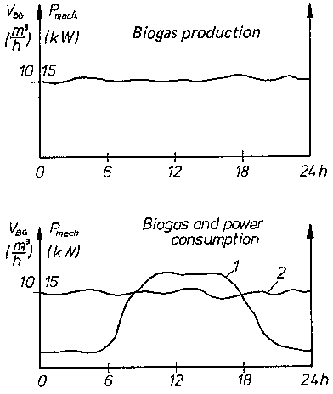 Similar considerations count in cases where the daily biogas production and the power demand are equal. While during low demand periods power is supplied to the public grid, in peak demand periods power is purchased from it. If favorable conditions can be negotiated with the public utility, the biogas gen-set can be designed for continuous operation in accordance with the continuous biogas production rate.