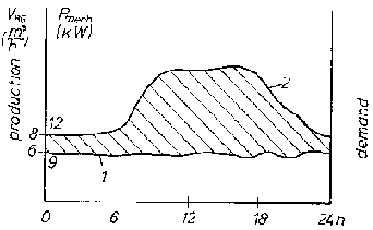 The given demand profile allows operation of the engine at a good efficiency for 10 hours a day. During the low demand period the engine can only be operated at almost idling conditions. Its use in this case is hardly economic as the cost for service, maintenance, operating personnel and the depreciation process are dependent on the actual operation period irrespective of the actual power produced.