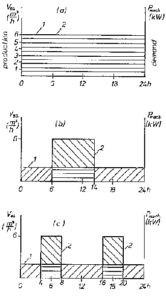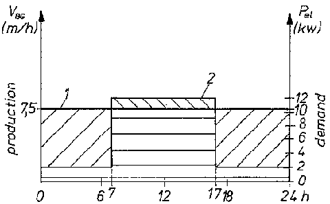 One way of equalizing the demand profile (Fig. 7.1) is the continuous operation of the engine, hence continuous fuel consumption. Instead of operating a powerful machine and engine for a short period per day the same service can often be obtained by a smaller system operating for a longer period. A similar effect is reached by the operation of different equipment in a sequence rather than at one time, e.g. water is pumped overnight while grains are milled during the day. The smaller system not only requires lower investment itself, but it also requires smaller or no gas storage capacities. The planning of the operational schedule of the equipment has a considerable effect on the economics and feasibility of biogas engine projects.