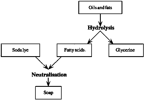 Fatty acid neutralisation is also carried out using soda or potash and produces the same type of soap as saponification. However, the end product is glycerine-free. It should be noted that the starting fatty acids are obtained by hydrolysis of oils and fats, which involves an additional stage. The glycerine formed is separated off by steam distillation.